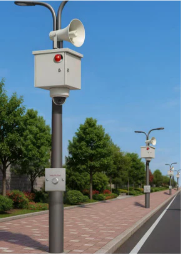 In this project, JideTech provides an integrated Smart Emergency Response System designed for urban safety management in Mexico. Each street installation consists of a compact all-in-one security box mounted on a light pole, combining audio-visual alerts, video surveillance, and emergency communication functions.